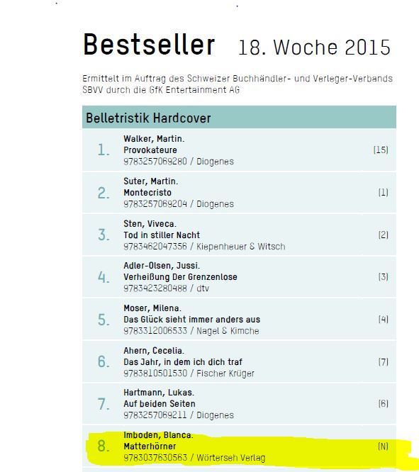 Mein Buch MATTERHÖRNER ist seit sieben Wochen in den Top Ten der Schweizer Bestsellerliste.